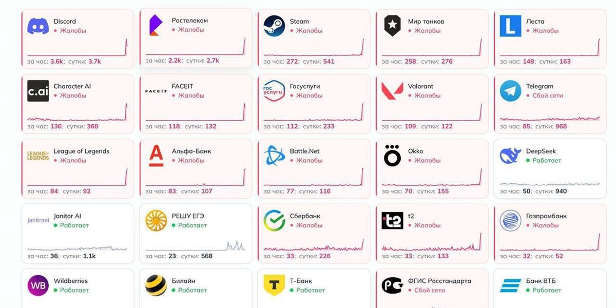 Зазначається, що користувачі скаржаться на масовий збій всього Рунету. За даними сервісу Downdetector, не працюють сайти онлайн-кінотеатрів, банків та соцмереж, а також кількох ігрових платформ. Особливо на збої скаржаться жителі Москви, Санкт-Петербурга, Самарської області.