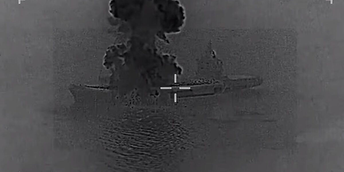 На кадрах видно, що перший потужний вибух стався в носовій частині судна – у районі польотної палуби. Після цього було друге влучення, вже в районі надбудови. Серія детонацій і пожежа, що швидко розповсюджується, призвели до знищення корабля.
