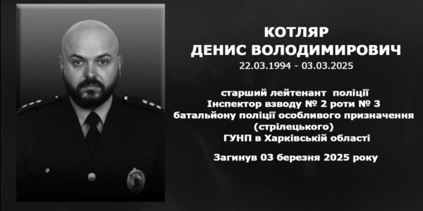 3 березня 2025 року на Донеччині автомобіль із поліцейським, яким керував Денис Котляр, був уражений російським FPV-дроном. Внаслідок ворожого удару Денис дістав поранення, несумісні з життям. Денис Котляр загинув, виконуючи свої професійні обов’язки та захищаючи нашу державу від ворога. Світла…
