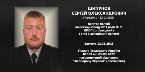 Капітан поліції Сергій Шипунов загинув 13 березня 2025 року під час виконання бойового завдання із захисту України від російської агресії на території Степногірської територіальної громади Запорізької області. У червні 2024 року Сергій став до лав батальйону поліції особливого призначення (стрілецького)…